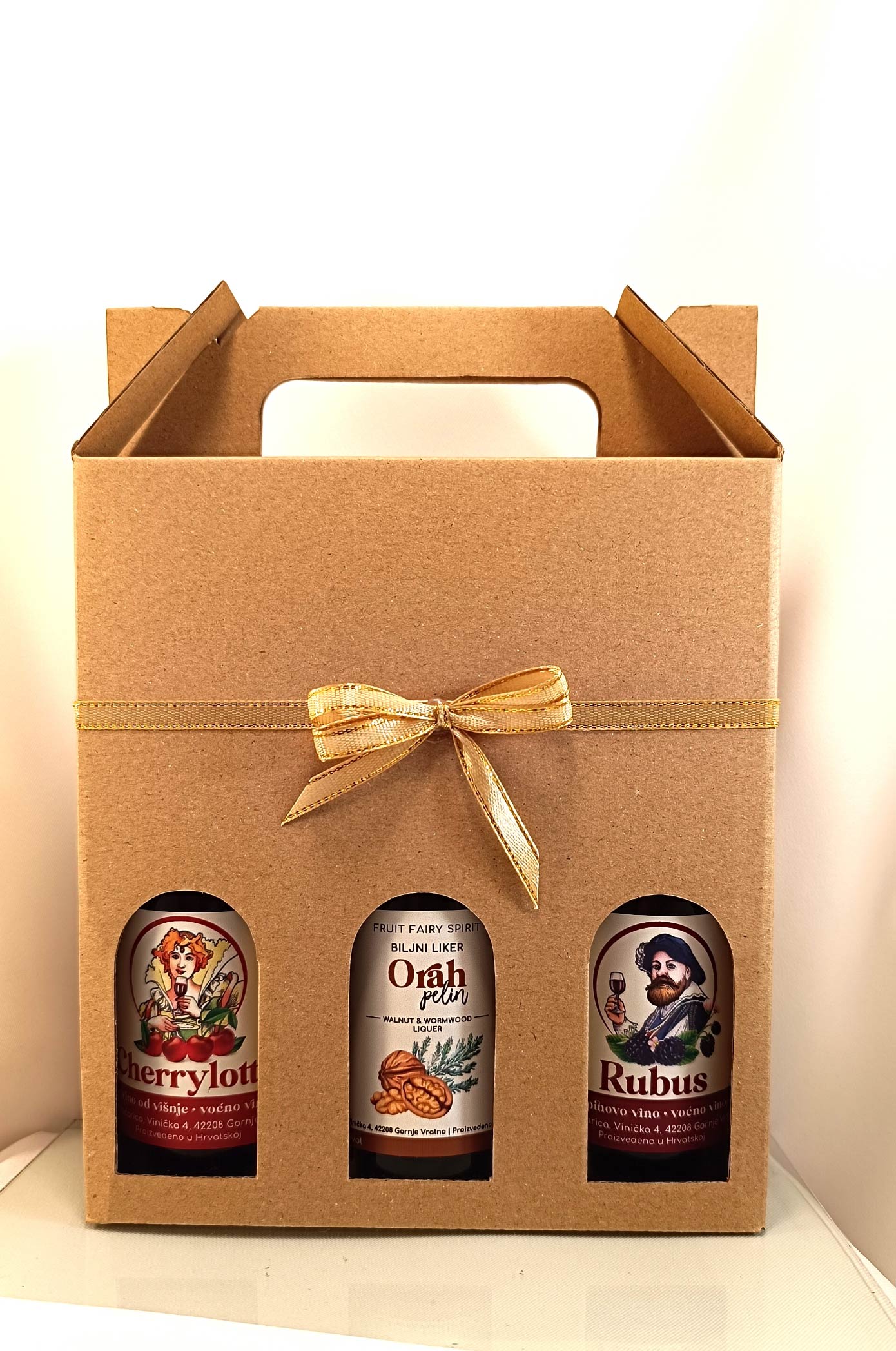 Kutija s dva kupinova vina, 2 x 0,187 L i boćica likera ili rakije 0,2 L, prigodno dekorirana.